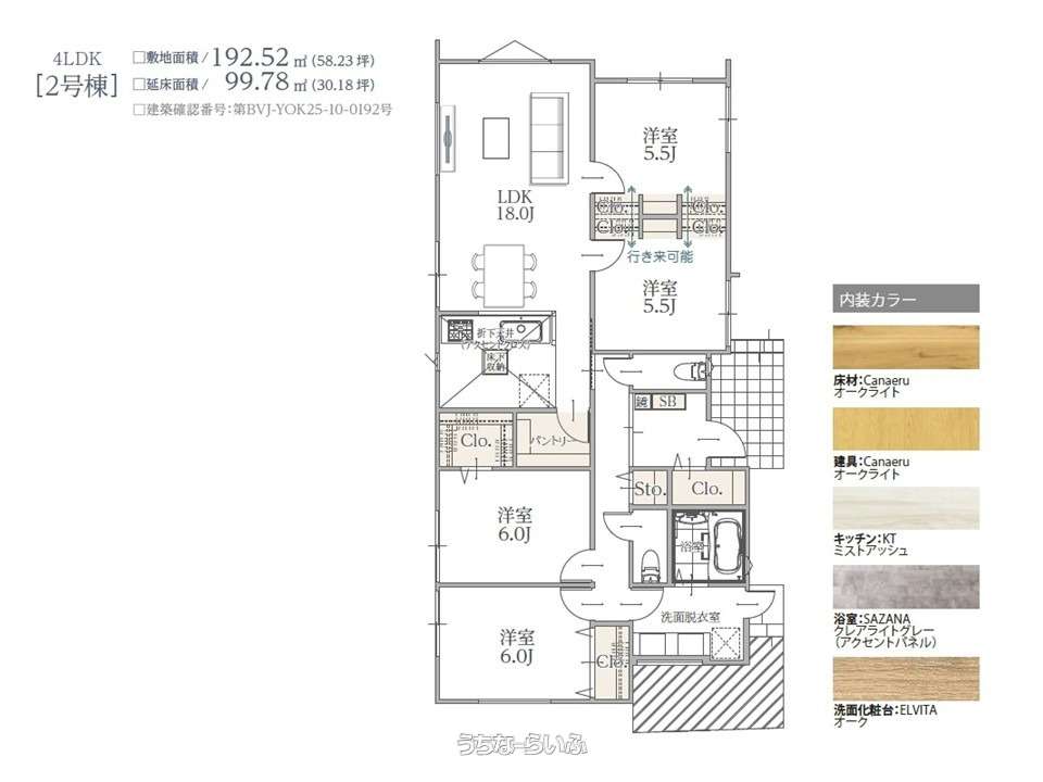 | 間取り | 4LDK ( 洋6 洋6 洋5.5 洋5.5 LDK18 ※床下収納、トイレ2ヵ所、SIC、洗面室勝手口、洗面室2口ボウル、WIC、パントリー) | ||