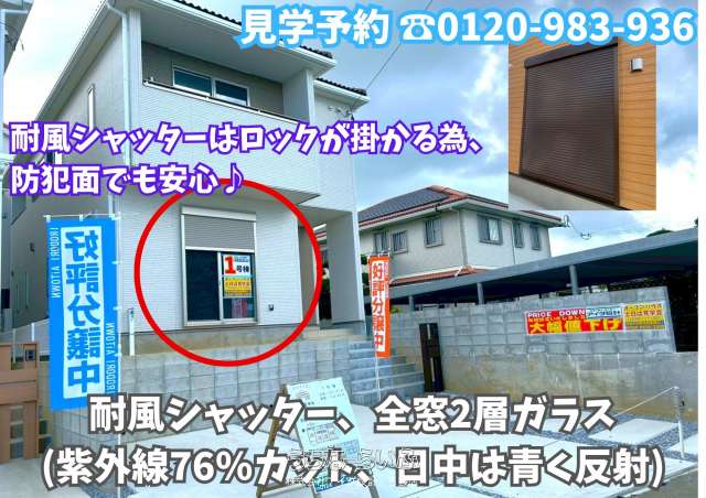 | 設備備考 | カップボード、網戸、二階洗面化粧台、1階掃き出し窓に耐風シャッター(ロック付き)多数初期設備特典有り! |