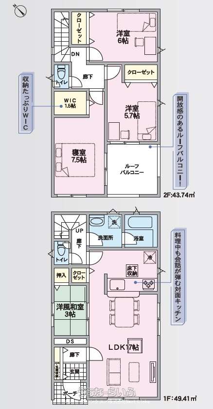 | 間取り | 4LDK ( 洋7.5 洋6 洋5.7 和3 LDK17 ※ルーフバルコニー) | ||
