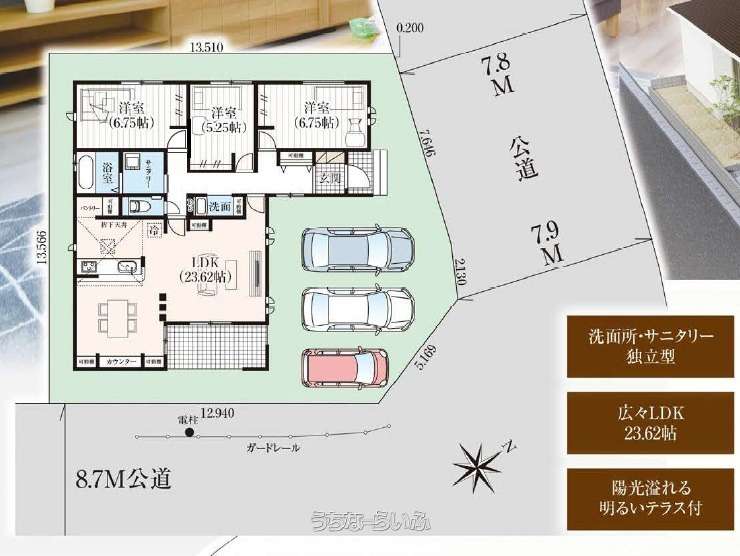 \平屋新築戸建て/ 土地60.6坪 並列駐車2~3台可能♪ 前面道路広々の角地です。お気軽にお問合せくださませ