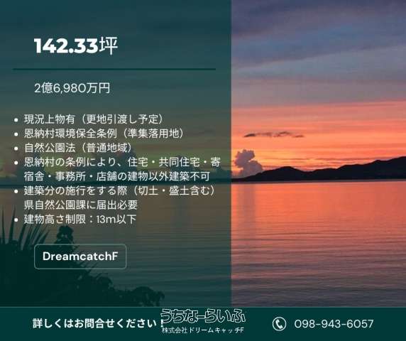 | 備考 | ■恩納村環境保全条例(準集落用地) ■自然公園法(普通地域) ■恩納村の条例により住宅・共同住宅・寄宿舎・事務所・店舗の建物以外の建築不可 ■建築分の施行をする際(切土・盛土含む)県自然公園課に届出必要 ■建物高さ制限:13m以下 ■現況: 所有者居住中 |