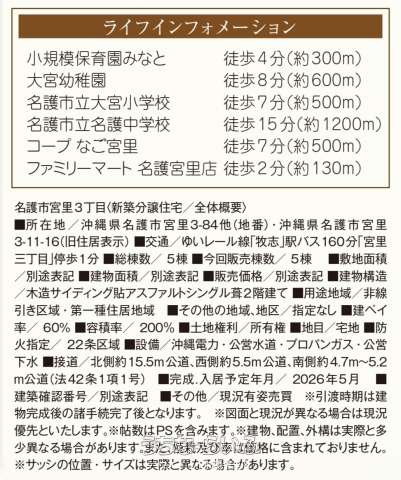| 備考 | □ファミリーマート 名護宮里店まで徒歩約2分(130m) □タウンプラザかねひで 大宮市場店まで徒歩約13分(950m) □沖縄海邦銀行 やんばる支店まで徒歩約10分(600m) □名護宇茂佐郵便局まで徒歩約14分(1km) □21世紀の森公園まで徒歩約7分(400m) """月々の支払い例↓ 琉球銀行 借入期間:50年 変動金利:0.75% 借入金額:3,390万円"" 月々67,771円~購入可能" 【長期優良住宅認定】 将来を見据えた“資産価値の高い住まい”。 耐震性・耐久性・省エネ性に優れ、税制優遇も受けられる安心設計。 台風の多い沖縄でも安心して暮らせる構造です。 子育て世代に人気の【長期優良住宅】 住宅ローン控除・固定資産税の軽減などメリット多数。 「長く安心して住める家」を基準に設計された一邸です。 【資産価値を重視する方へ】 国の基準を満たした長期優良住宅。 将来の売却時にも評価されやすい“価値が落ちにくい家”。 台風・高温多湿・塩害環境を考慮した【長期優良住宅】 耐久性・維持管理計画が明確な、沖縄向きの安心住宅。 固定資産税減税 一般住宅の場合は 3年間 → 長期優良住宅は5年間 に延長 """ハウスドゥ那覇首里店の強み ①住宅ローンについて詳しくご説明♪ 自分にあった支払額や借入限度額を知りたい方 資金計画を立てたい方、住み替えをお考えの方 担当スタッフが詳しくご説明します!! ②ご家族で来店できる仕組み 店舗前に駐車場が2台・キッズスペース完備しています。 お子様連れでも安心してご相談できます♪ ③豊富な物件情報!! 「ハウスドゥ那覇首里店」ではポータルサイトやHPに掲載している物件や 他社様から売り出されている物件など、たくさん掲載しております!! ④物件ツアー開催!! お客様がご要望の物件をピックアップしまとめてご案内☆ ⑤登録無料のMYページ MYページ登録をすることでHPやポータルサイトに上がる前にいち早く 物件情報を得ることが出来ます!! MYページリンク↓ https://nahashuri-housedo.com/mypageintroduction/ ⑥新型コロナウイルス感染防止の取り組み ・スタッフ一同マスクを付けて接客 ・店内入口に手指消毒用のアルコールを設置 ・念入りなアルコール消毒清掃を実施 ハウスドゥ那覇首里店は ☆2022年お問い合わせ件数全国1位☆ お気軽にお問い合わせください!! スタッフ一同お待ちしております♪"" ※ハウスドゥ全国大会で紙媒体でのお問い合わせ件数が全国700店舗中1位 2022年11月2日開催 ■現況: 建築中 ■建築確認番号: 第HPA-25-0000000-1号 |