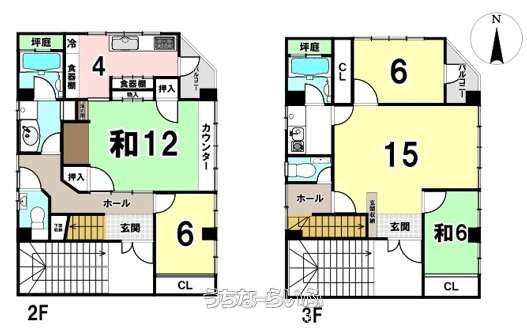 | 間取り | 5DK ( 洋15 洋6 和12 和6 和6 DK4 ※2階・3階それぞれに玄関、キッチン、浴室あり。) | ||