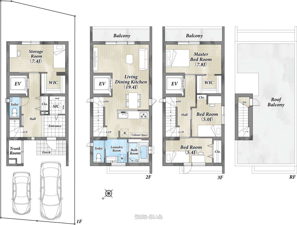 | 間取り | 4LDK ( 洋7.4 洋7.8 洋5 洋5.4 LDK19.4 ※ルーフバルコニー付き) | ||