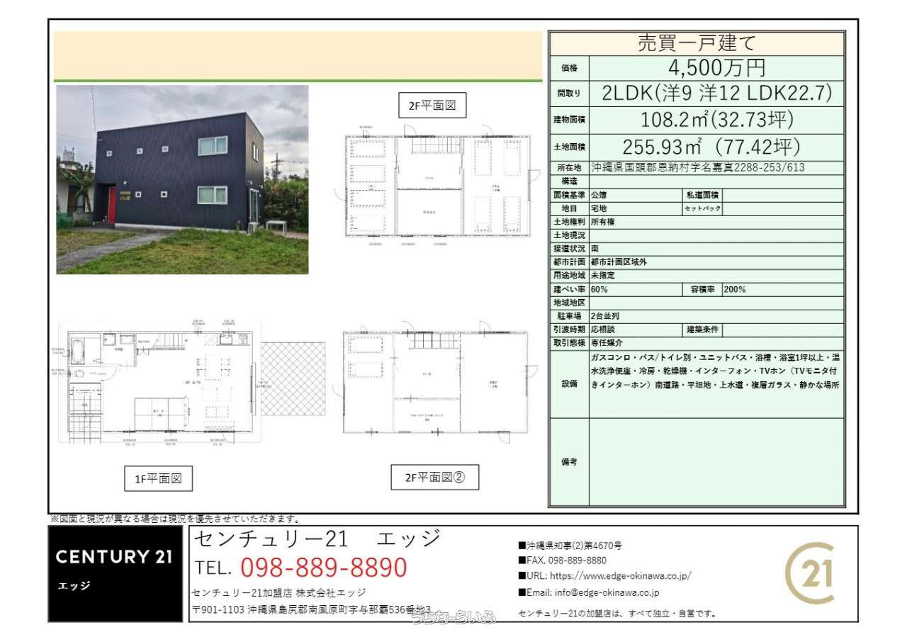 | 建物面積 | 108.2m² / 32.73坪 | 土地面積 | 255.93m² / 77.42坪 |