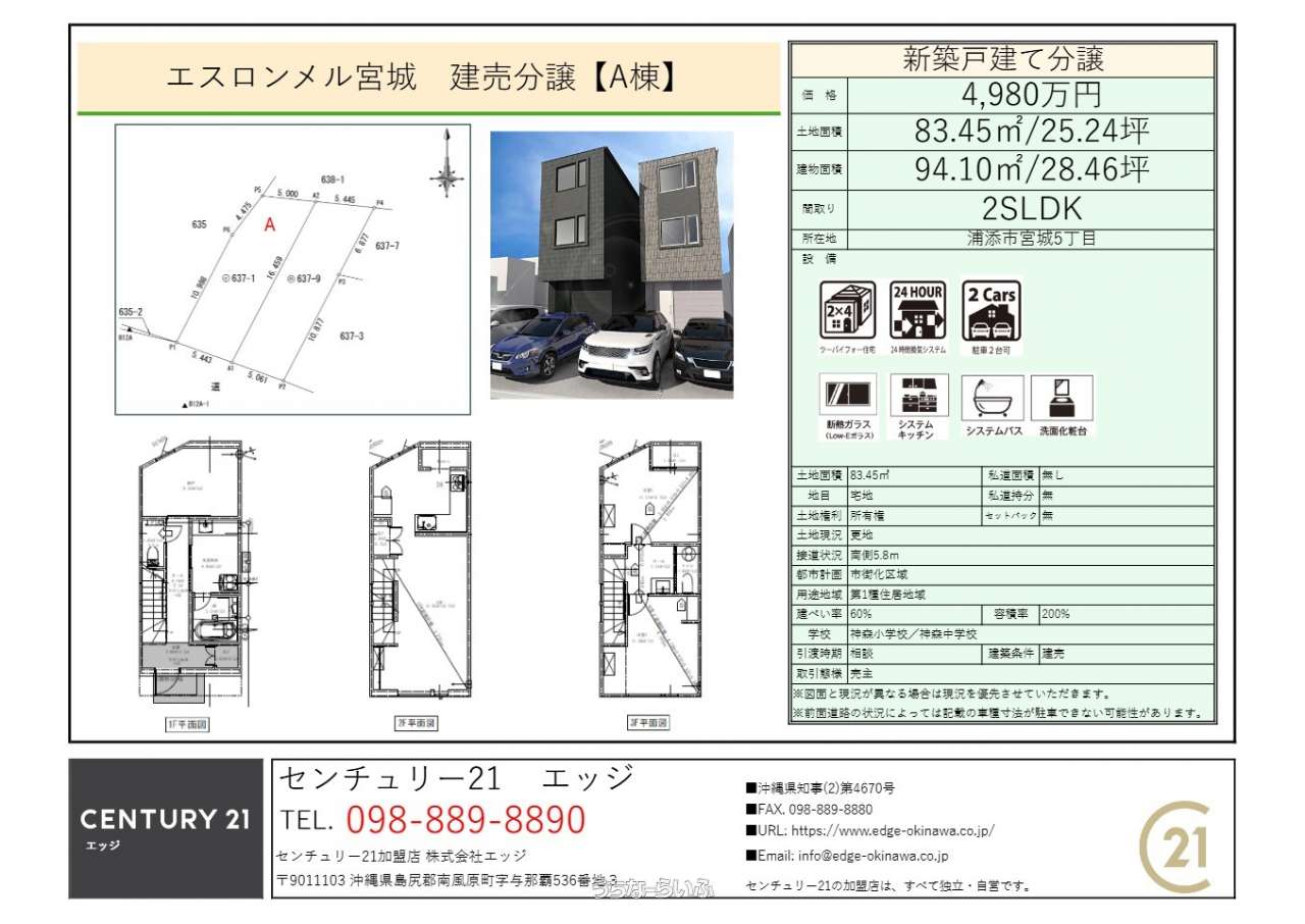 | 価格備考 | 土地面積25.24坪・延床面積28.46坪の建売物件が4,980万円となります。 | ||