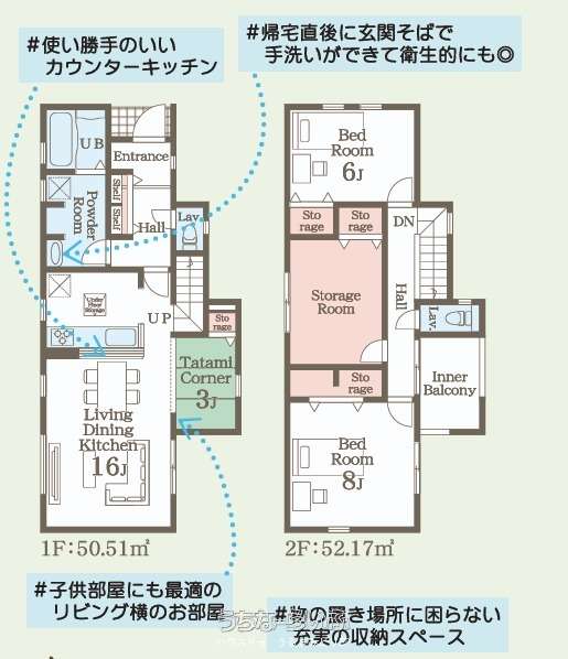 | 間取り | 2SLDK ( 洋6 洋8 SLDK16 ※1F(タタミコーナー3帖)、2F(ストレージルーム)) | ||