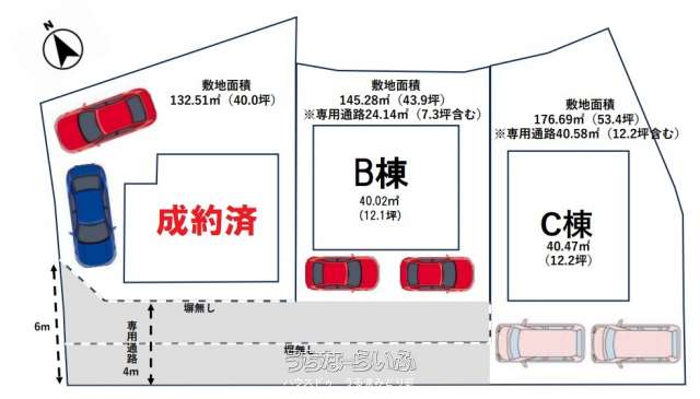 | 引き渡し | 相談 | 接道方向 / 道路幅員 | 北西6m |