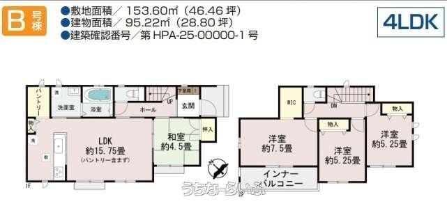 | 建物面積 | 95.22m² / 28.8坪 | 土地面積 | 153.6m² / 46.46坪 |