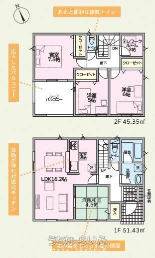 | 間取り | 4LDK ( 洋7.5 洋6 洋5 和4.5 LDK16.2 ※玄関収納、2階テレワークルーム2帖、トイレ2カ所、ルーフバルコニー) | ||
