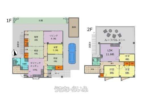 | 間取り | 7LDK ( 洋5.3 洋4 洋6 洋6 和8 和6 和6 ※◆1F:◎ダイニングキッチン10帖 ◎リビング8.3帖 ◎和室:8帖・6帖・6帖 ◎洋室:5.3帖 ◆2F:◎LDK11.6帖 ◎洋室:4帖・6帖・6帖 ) | ||