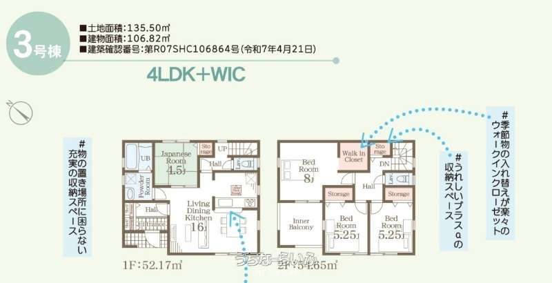 | 収納 | ウォークインクローゼット 、 シューズインクローク 、 床下収納 、 全居室収納 |