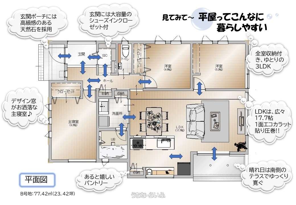 | 間取り | 3LDK ( 洋6.2 洋5.2 洋4.5 LDK17.7 ※全室収納付、シューズインクローク、パントリー、デッキテラス有) | ||