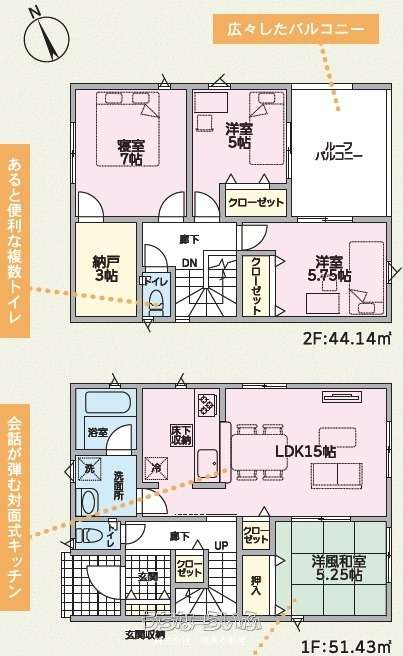 | 間取り | 4LDK ( 洋7 洋5 洋5.7 和5.2 LDK15 ※ルーフバルコニー) | ||
