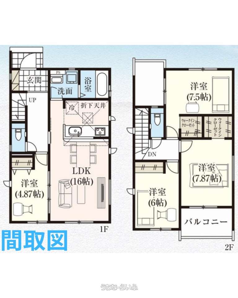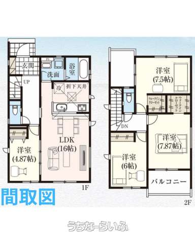 | 間取り | 4LDK ( 洋4.8 洋6 洋7.5 洋7.8 LDK16 ※※トイレ2ヵ所、バルコニー、全居室収納、ウォークインクローゼット×2) | ||