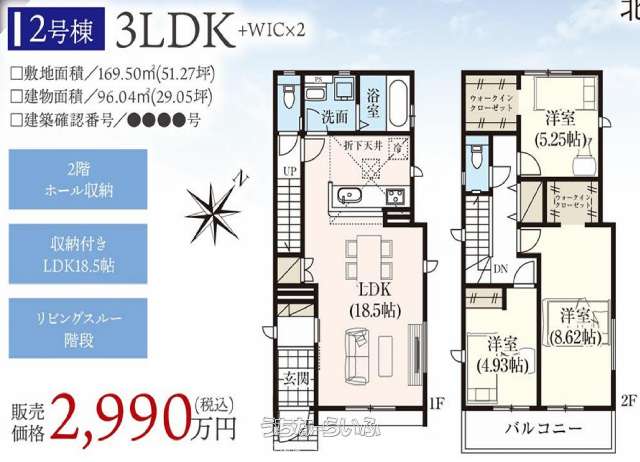 | 間取り | 3LDK ( 洋8.6 洋5.2 洋4.9 LDK18.5 ※ウォークインクローゼット×2・全室収納有) | ||