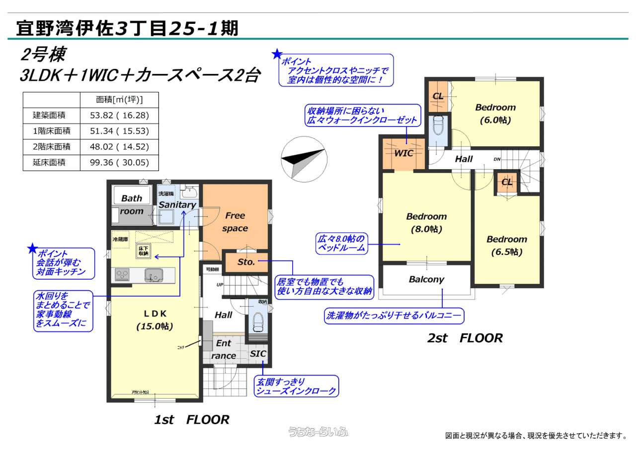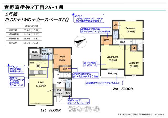| 間取り | 3LDK ( 洋8 洋6.5 洋6 ※床下収納、トイレ2ヶ所、フリースペース) | ||