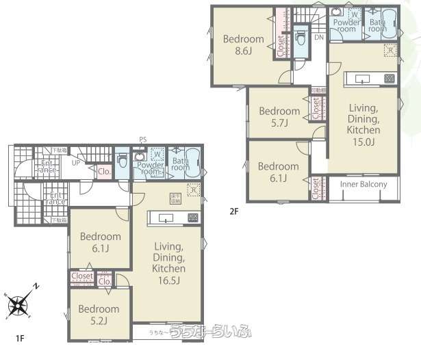 | 間取り | 2LDK ( 洋6.1 洋5.2 LDK16.5 ※2階:洋8.6 洋6.1 洋5.7 LDK15 ※完全分離型2世帯住宅) | ||