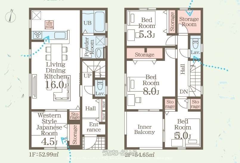 | 間取り | 4LDK ( 洋8 洋5.3 洋5 和4.5 LDK16 ※床下収納、トイレ2ヶ所、ストレージルーム(3.31㎡)) | ||