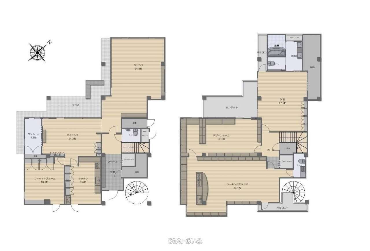 | 間取り | 4LDK ( 洋17.5 洋18.4 洋10.6 洋30.4 LDK48.6 ※【リビング24.8帖】【ダイニング14.2帖】【キッチン9.6帖】【洋室詳細:洋室17.5帖・デザインルーム18.4帖・フィットネスルーム10.6帖・クッキングスタジオ30.4帖】) | ||
