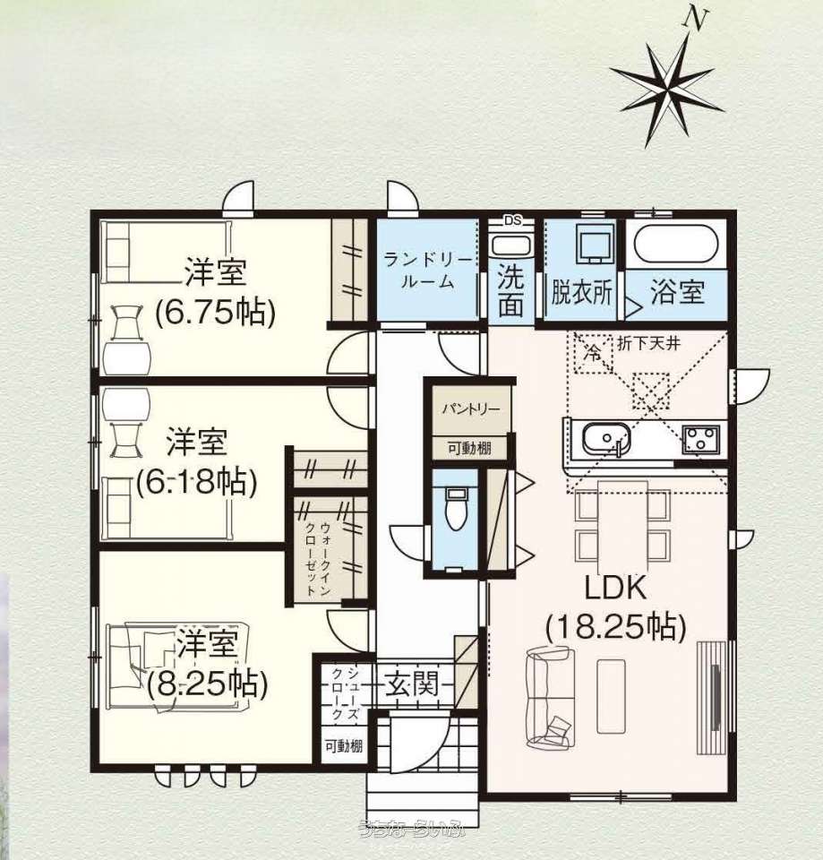 | 間取り | 3LDK ( 洋8.2 洋6.1 洋6.7 LDK18.2 ※ランドリールーム SIC付 WIC付 1階建ての平屋になっております。) | ||