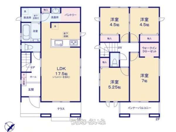 | 間取り | 4LDK ( 洋7 洋5.2 洋5.2 洋4.5 LDK17.2 ※パントリー、WIC、テラス、インナーバルコニー) | ||