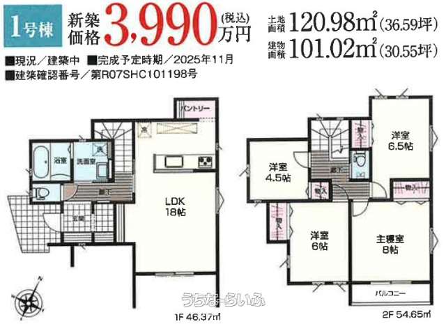 | 建物面積 | 101.02m² / 30.55坪 | 土地面積 | 120.98m² / 36.6坪 |