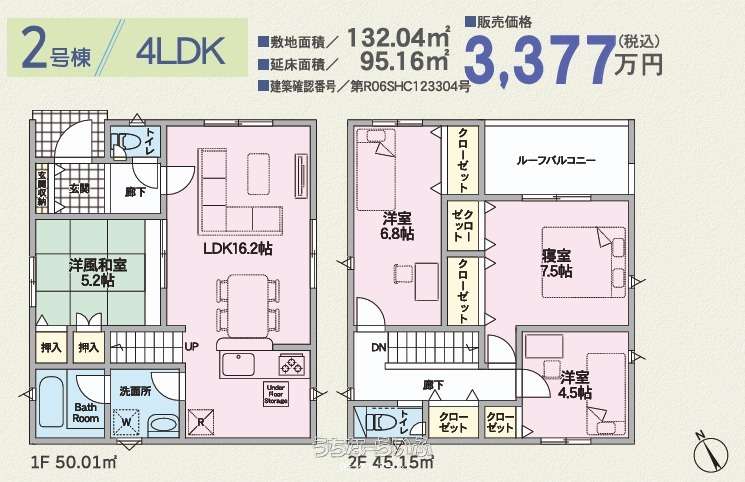 | 間取り | 4LDK ( 洋7.5 洋6.8 洋4.5 和5.2 LDK16.2 ※床下収納、ルーフバルコニー) | ||