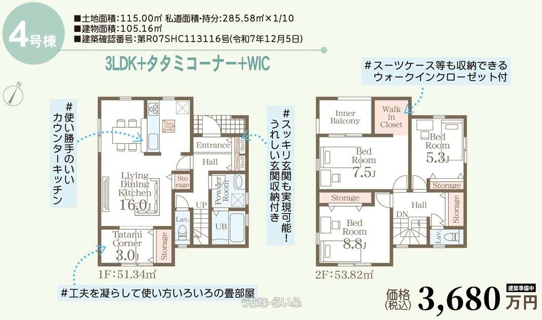 | 収納 | ウォークインクローゼット 、 シューズボックス 、 全居室収納 |