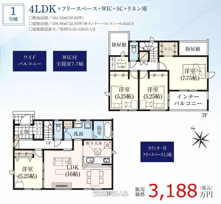 | 建物面積 | 108.88m² / 32.93坪 | 土地面積 | 194.59m² / 58.86坪 |