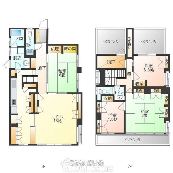 | バス・トイレ | バス/トイレ別 、 浴槽 、 独立洗面所 、 トイレ2ヶ所 |