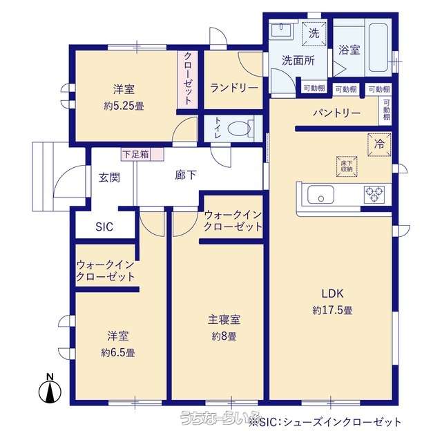 | 間取り | 3LDK ( 洋8 洋6.5 洋5.2 LDK17.5 ※シューズクローク・パントリー・ランドリールーム・ウォークインクローゼット) | ||