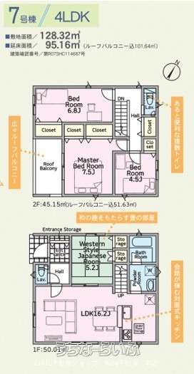 | 間取り | 4LDK ( 洋7.5 洋6.8 洋4.5 和5.2 LDK16.2 ※ルーフバルコニー) | ||