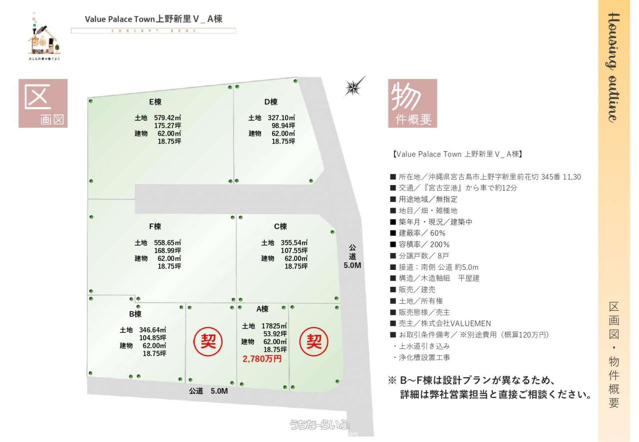 | 備考 | ※A棟は設計プランが異なります。 他分譲地につきましては、お問合せください。 宮古島市内に弊社モデルルームをご用意しております。 物件の内装や外観などをご覧いただき、実際に住まわれた時のイメージがつきやすくなるかと存じます。 ご予約制とさせていただいておりますので、ご希望のお客様はお気軽にご連絡ください。 ■現況: 未着工 ■建築確認番号: 確認中 |