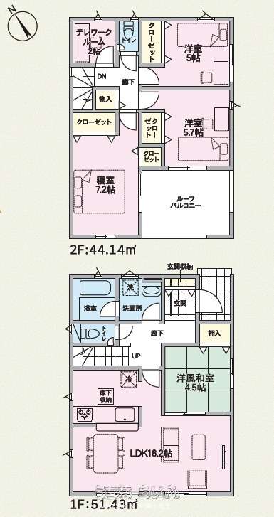 | 間取り | 4LDK ( 洋7.2 洋5.7 洋5 和4.5 LDK16.2 ※床下収納+テレワークルーム2帖) | ||