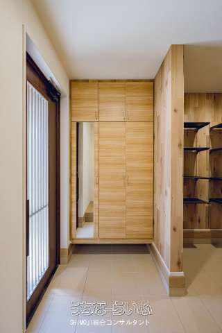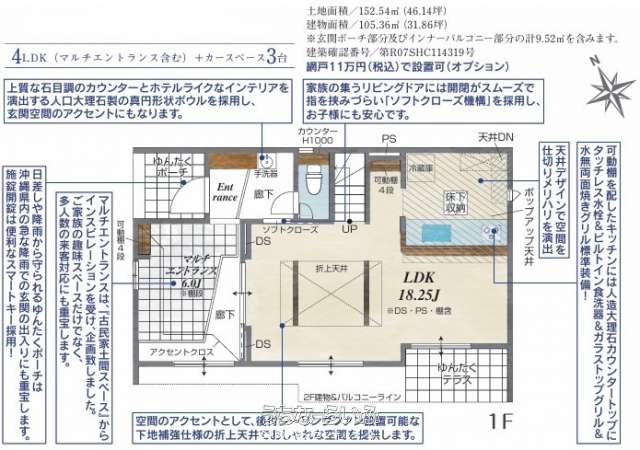 限定1邸の長期優良認定住宅。太陽光発電システム搭載で停電時に非常用コンセントが使用可能。 古民家土間スペースからインスピレーションを受けたマルチエントランスは多人数の来客対応にも重宝します。
