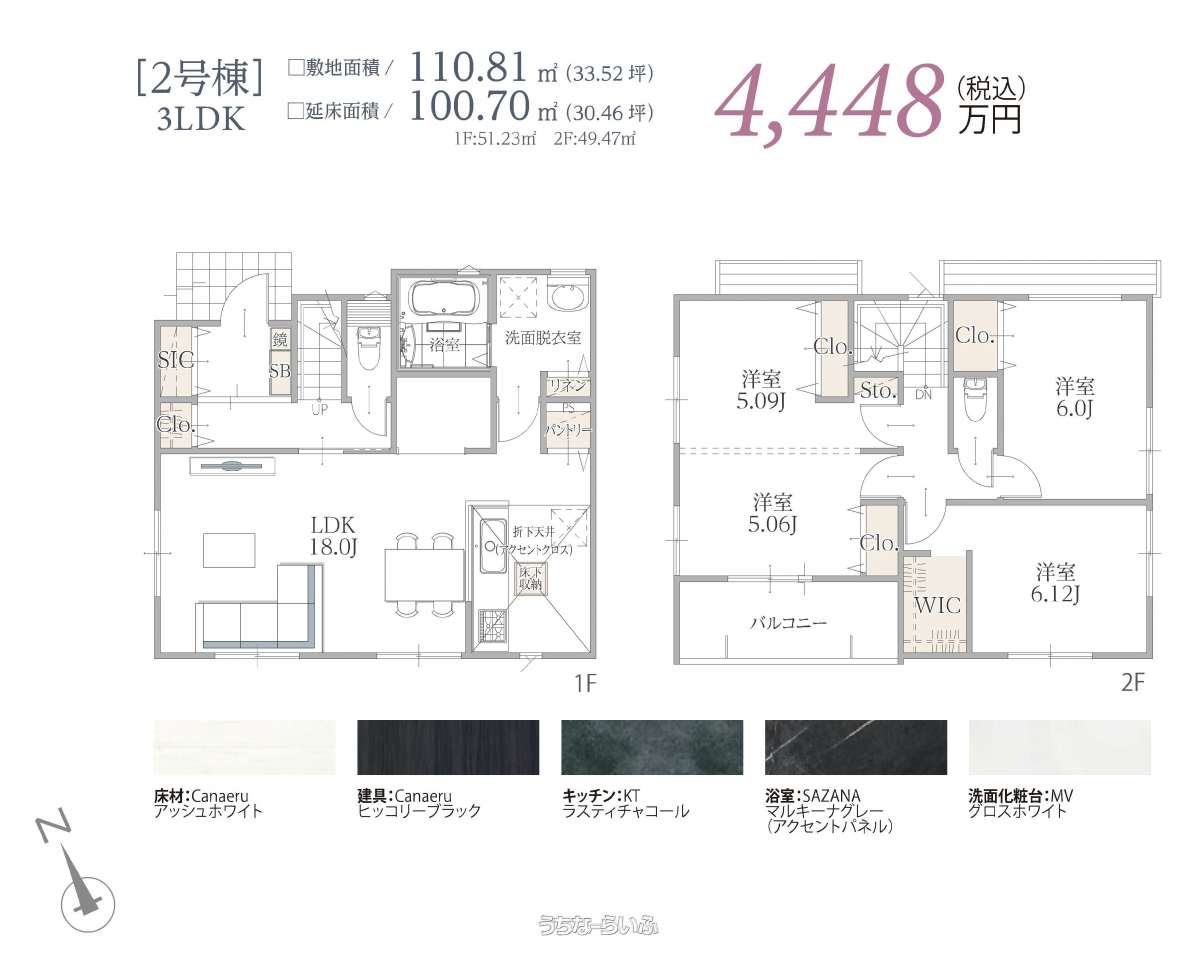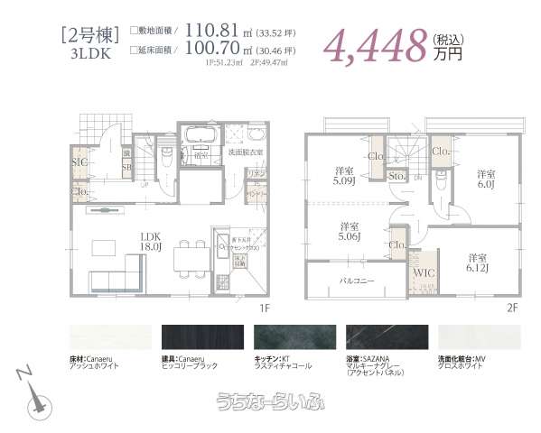 | 間取り | 4LDK ( 洋5 洋5.2 洋6 洋6.1 LDK18.5 ※1号棟:4LDK・2号棟:3LDK) | ||