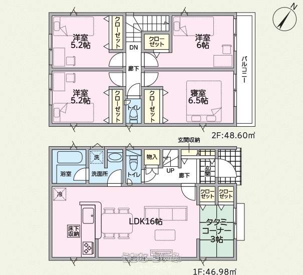 | 間取り | 4LDK ( 洋6.5 洋6 洋5.2 洋5.2 LDK16 ※タタミコーナー・全室収納・バルコニー・トイレ2ヶ所) | ||