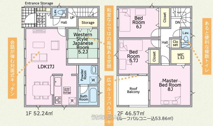 | 間取り | 4LDK ( 洋8 洋6 洋5.7 和5.2 LDK17 ※タタミコーナー・全室収納・バルコニー・トイレ2ヶ所) | ||