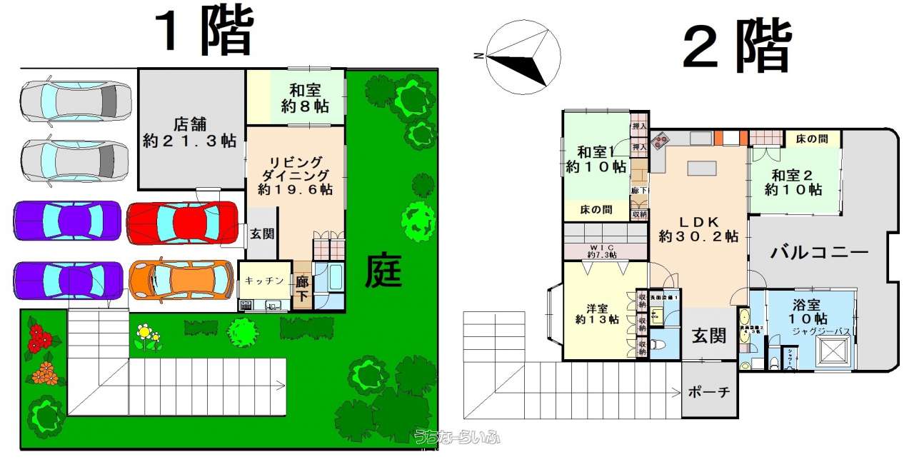 3LDK ( 洋13 和10 和10 LDK30.2 ※【1階部分2LDK:店舗としての利用も可能】和室約8帖、店舗21.3帖、LDK約19.6帖)