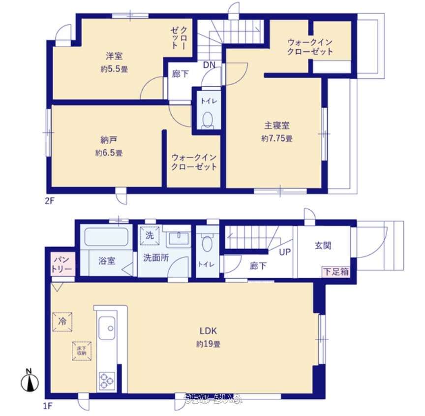 | 間取り | 2SLDK ( 洋7.7 洋5.5 SLDK19 ※広々6帖の納戸があり、季節物の収納や趣味スペースとしても活用できます。) | ||