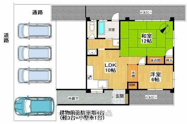 | 間取り備考 | 2LDK:LDK(10畳)、和室(12畳)、洋室(6畳) バス・トイレ別 | ||