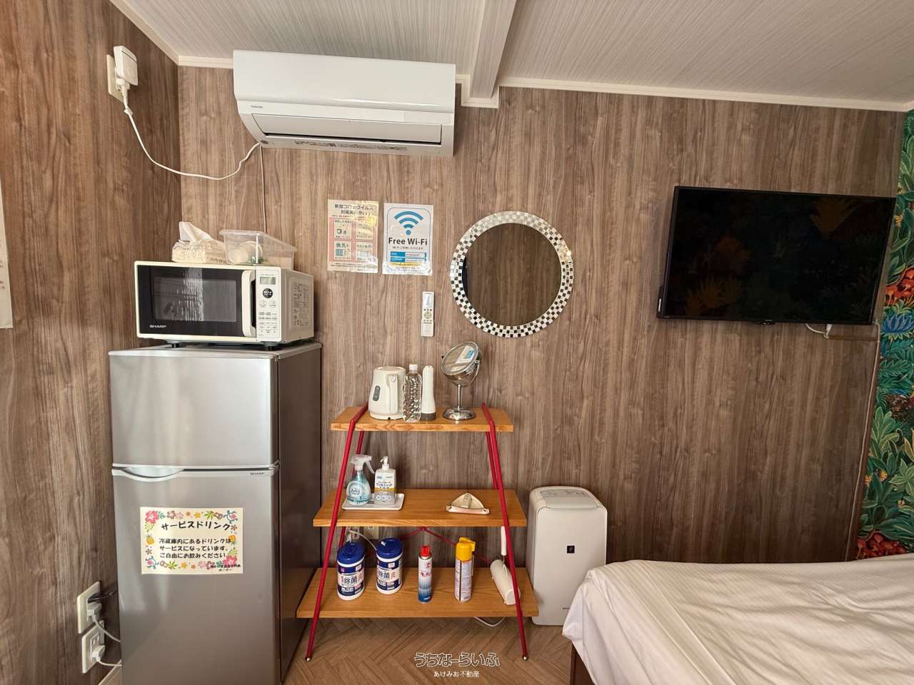 | 内装・設備 | エアコン (冷暖房あり) 、 冷房 (クーラー) 、 トイレ 、 温水洗浄便座 、 敷地内ゴミ置き場 、 冷蔵庫 、 テレビ |