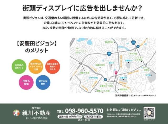 | 備考 | 【中部エリア企業様限定価格】1ヶ月、1日1時間の枠。時間指定可能。画像データ及び動画データ持ち込み。 LED画面のサイズ縦1,920mm×横2,560mm。 街頭LEDビジョンに広告を出しませんか? 複数の画像や動画を使って会社の認知度及び集客アップに活用して頂ければと思います。 詳しくは親川不動産までお問い合わせくださいませ。 |