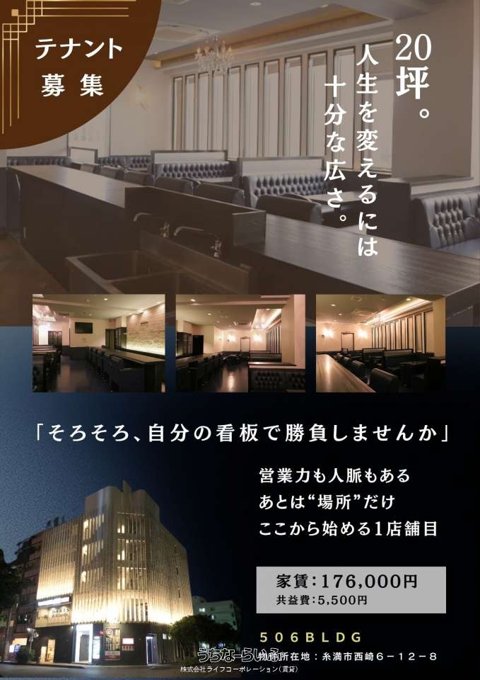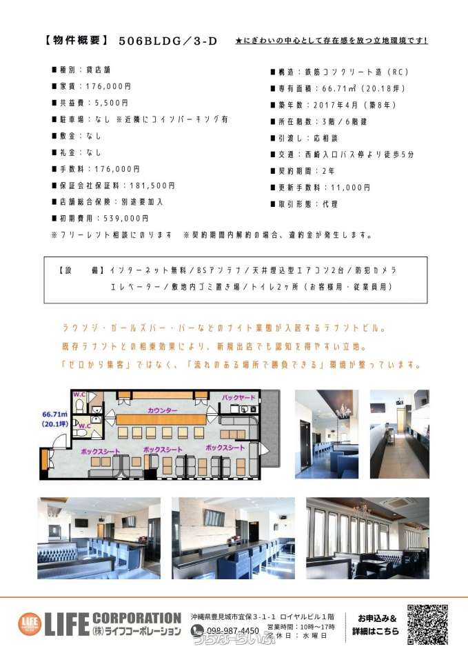 | 備考 | ◆506ビルディング◆ 3-D 店舗事務所募集中!!飲食店も可能です!! カラオケハウスとまと西崎店隣!! ☆当ビル1階には大人気居酒屋「OKINAWA DINING かあびら」 フロア66.71平米(20.18坪) ★敷金なし ★礼金なし ★保証金なし ■エレベーター完備 (防犯用カメラエレベーター内にカメラ完備) (1階エレベーター前、内部が見れるモニターあり) ■防犯カメラ完備 ■インターネット無料!つなぎ放題! ■店舗名表示用の看板あり ■BS・地デジアンテナ ■居抜き店舗(カウンターテーブル・カウンター席7席・ボックスシート席6組・スツール7個・カウンター内に2層シンク・バックヤード内にシンク&作業台・ボトル収納3ヶ所) ■手洗器 ■バックヤード ■天井埋込型エアコン2台 ■トイレ2ヶ所(お客様用・従業員用) ■角部屋 ■窓が豊富 ■お洒落な内装カラー ■間接照明 ■ダウンライト ■シャンデリアライト ■換気扇完備 ■店内照度の調節可能 ※契約期間内解約の場合、違約金が発生します。 ☆ビル周辺にコインパーキングあり☆ ・タイムズ西崎6丁目 ・アットパーク西崎6丁目第2 カラオケ機器は設備ではありません。入居者様で直接ご契約をお願いします。 レンタル料 月額31,000円・35,000円・43,000円の3種類あり。 ※サービス内容の詳細は、㈱カジ・コーポレーション 沖縄営業所 へお問い合わせください。 【店舗総合保険について】 契約開始日までに契約者様で必ずご加入ください。 ※当資料が現状と異なる場合は、現況を優先いたします。その際は、ご了承ください。 【近隣施設情報】 カラオケハウスとまと隣 糸満市西崎の繁華街近く ファミリーマートまで徒歩4分 スーパータウンフプラザかねひで隣 沖縄銀行西崎支店隣 琉球銀行西崎支店まで徒歩5分 沖縄海邦銀行西崎支店まで徒歩7分 カインズホームまで車で1分 カラオケボックスぶぶカラまで徒歩4分 魚町屋ぶぶかまで徒歩5分 |