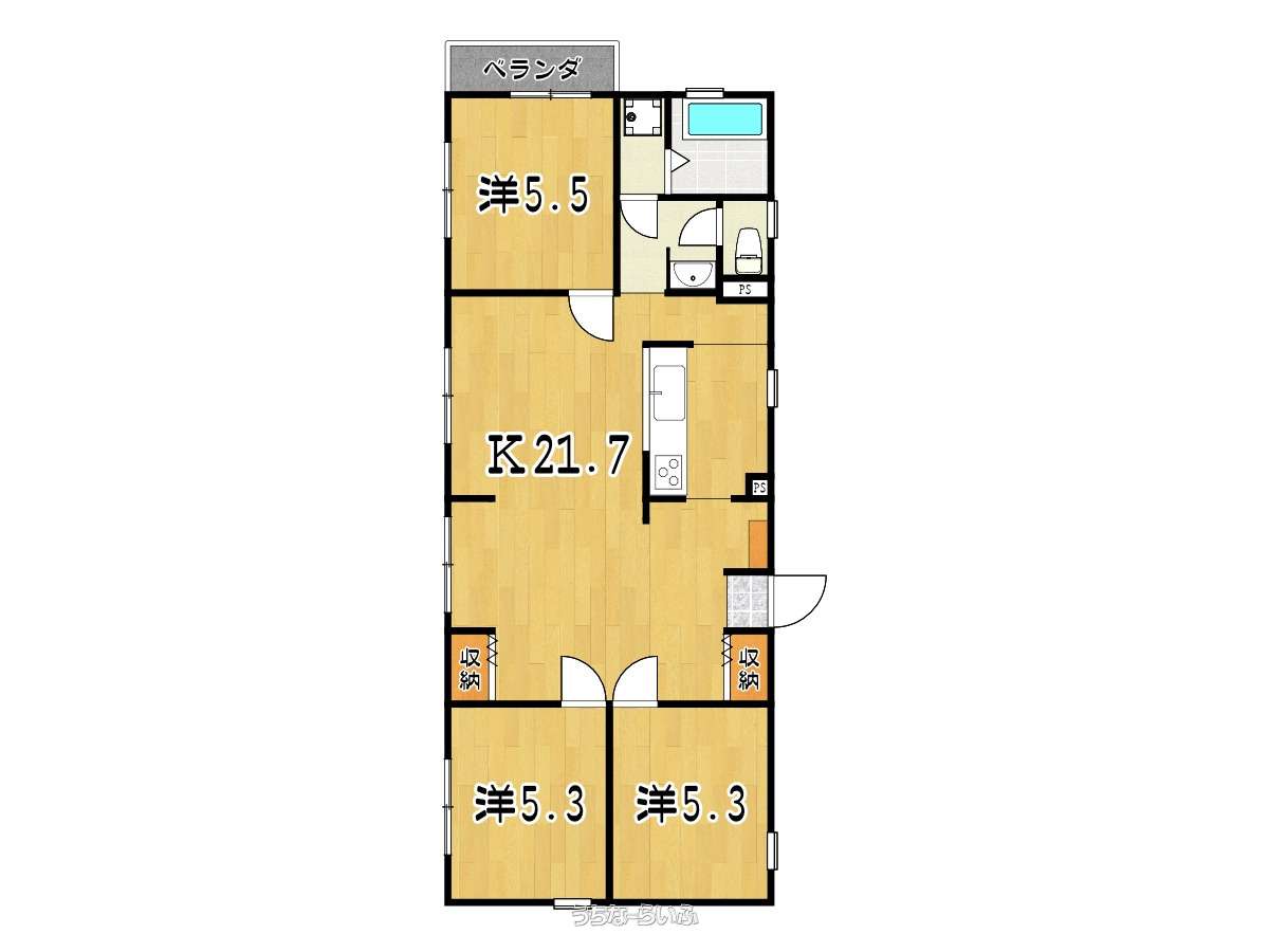 | 間取り | 3LDK ( 洋5.5 洋5.3 洋5.3 LDK21.7 ※1フロア1世帯(角部屋・三面採光)) | ||