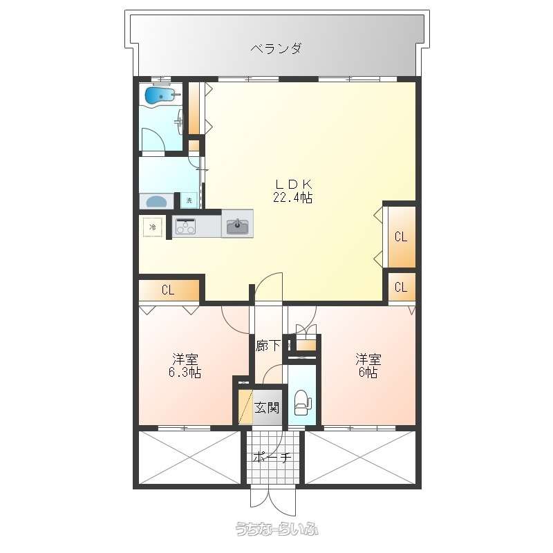 | 間取り | 2LDK ( 洋6 洋6.3 LDK22.4) | ||