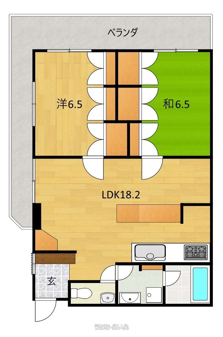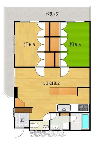 | 間取り | 2LDK ( 洋6.5 和6.5 LDK18.2 ※間取りや方位が現況と異なる場合は現況を優先とします。) | ||