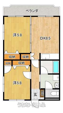 | 間取り | 2DK ( 洋5.8 洋5.8 DK8.5 ※間取りや方位が現況と異なる場合は現況を優先とします。) | ||