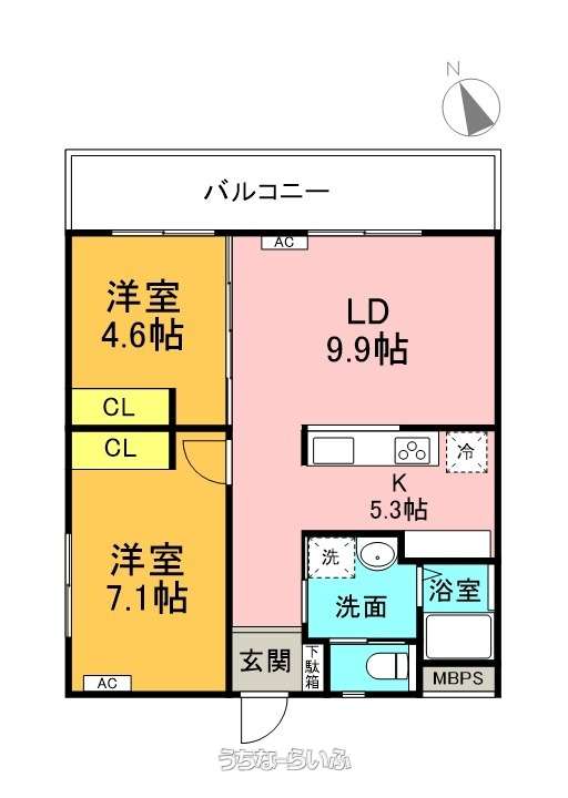 | 間取り | 2LDK ( 洋7.1 洋4.6 LDK15.2 ※専有面積60㎡(18坪)、対面キッチン) | ||